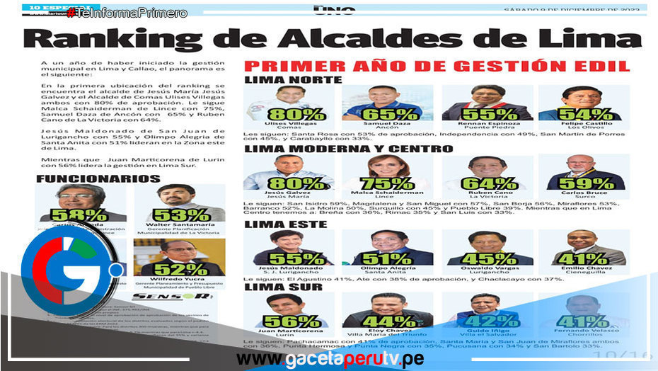 En el segundo lugar de este destacado ranking se encuentra el alcalde de Ancón, con un sólido 65% de aprobación en su gestión. Le sigue de cerca el alcalde de Puente Piedra, ubicándose en el tercer lugar con un 55% de progreso. No menos destacado, el alcalde de Los Olivos, Felipe Castillo, se posiciona en el cuarto lugar con un respetable 54%.