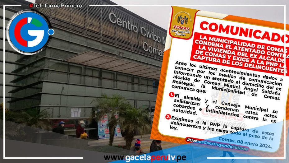 Comas.- En un reciente comunicado, la Municipalidad Distrital de Comas expresó su enérgico repudio ante el atentado perpetrado contra la residencia del ex alcalde Miguel Ángel Saldaña Reátegui. La comunidad comasina se une para condenar estos actos cobardes que buscan intimidar a una figura destacada de la localidad.