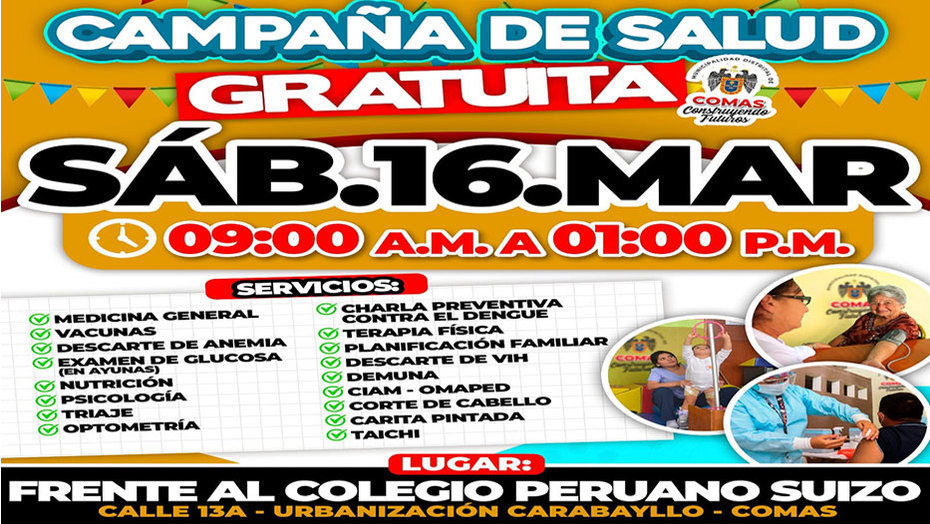 La actividad se llevará a cabo el sábado 16 de marzo de 2024, desde las 09:00 a.m. hasta la 1:00 p.m., brindando a los vecinos la oportunidad de recibir atención médica y realizar consultas sobre diversos temas de salud.