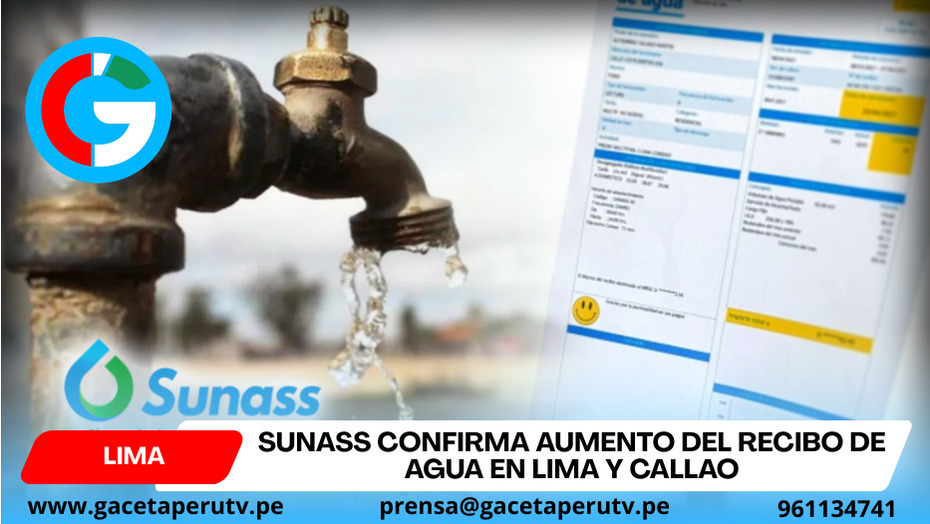 Lima.- La Superintendencia Nacional de Servicios de Saneamiento (Sunass) oficializó un aumento en el recibo de agua potable y alcantarillado para los usuarios de Lima y Callao, medida que empezará a aplicarse desde enero de 2026 y se verá reflejada en los recibos emitidos a partir de febrero.
