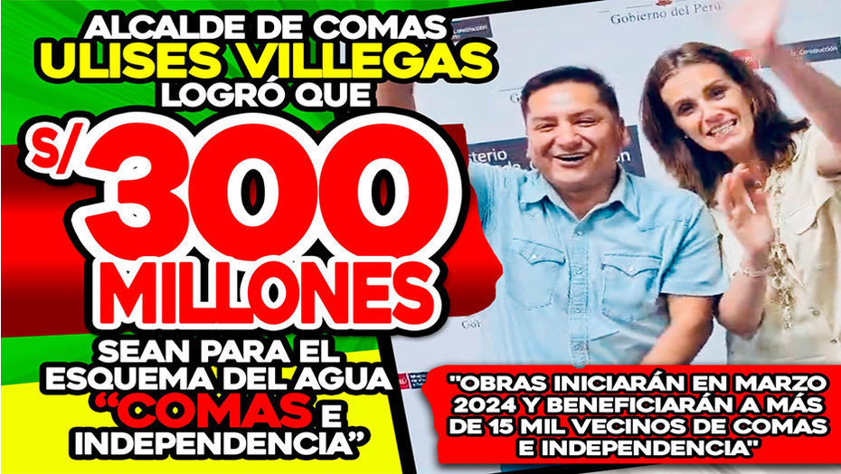 Comas.- En un gesto significativo de compromiso y colaboración, la ministra de Vivienda, Hania Pérez de Cuellar, y el alcalde de la municipalidad de Comas, Ulises Villegas, sellaron un acuerdo para iniciar, en marzo de 2024, los trabajos que permitirán que más de 15 mil familias en los distritos de Comas e Independencia accedan finalmente al servicio de agua y desagüe.