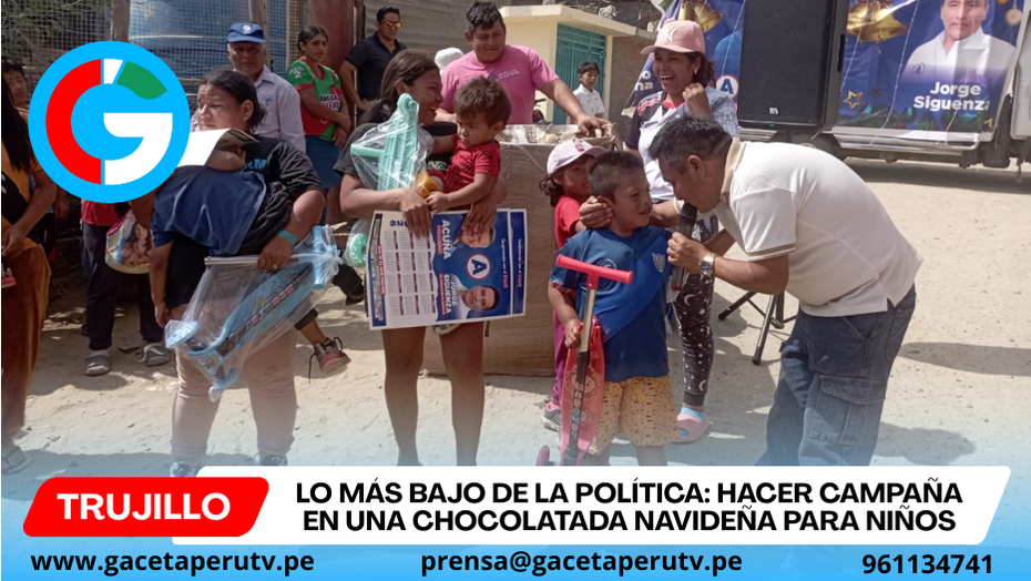 En chocolatadas que ofreció la Universidad César Vallejo en Alto Trujillo, el militante de Alianza Para el Progreso y aspirante al sillón municipal de ese distrito, Jorge Sigüenza Quispe, estuvo regalando calendarios con el símbolo de su partido, la “A”, a los niños que asistieron a este evento navideño con la sana esperanza de recibir un juguete, chocolate y panetón.