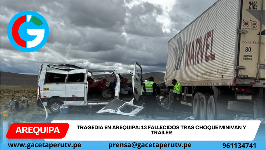 Arequipa.- Un trágico accidente de tránsito en Arequipa dejó 13 muertos, entre ellos una menor de edad, tras un violento choque frontal entre una minivan y un tráiler en una carretera de la región.